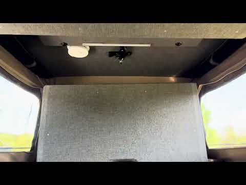 • Interior features include Diva cabinetry, butcher block counters, swivel captain's chairs, underfloor storage, Isotherm 130 refrigerator, exterior shower, and an onboard toilet. A Danhard A/C unit keeps the cabin cool while off-grid.